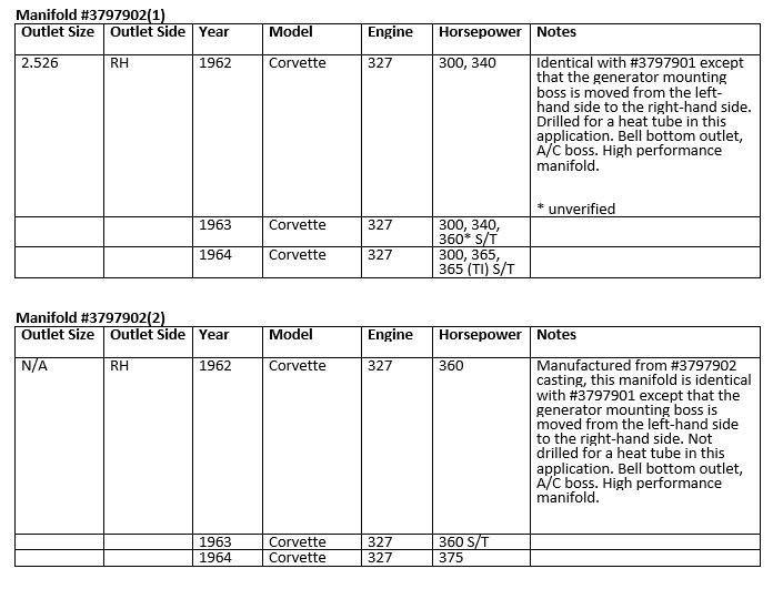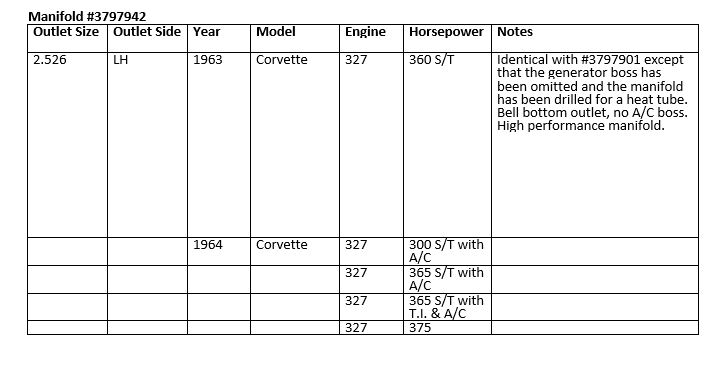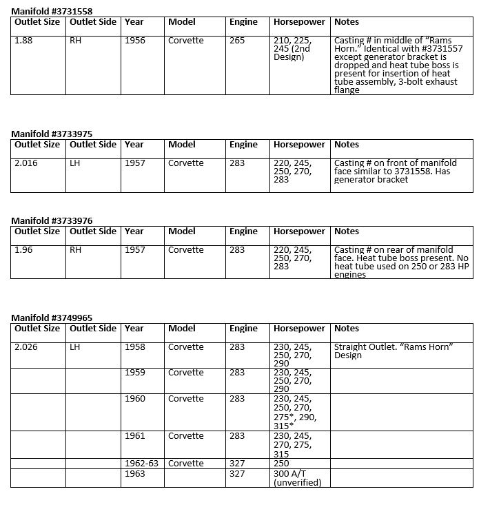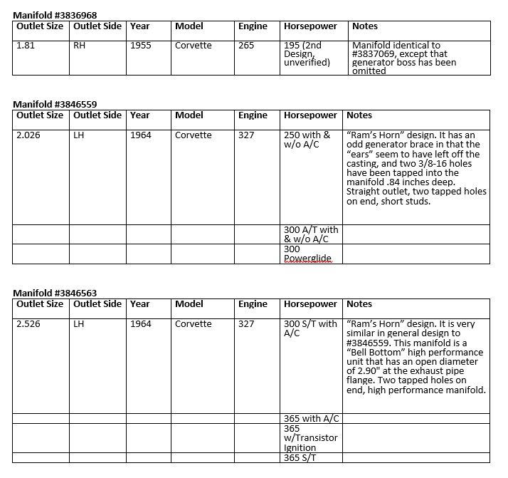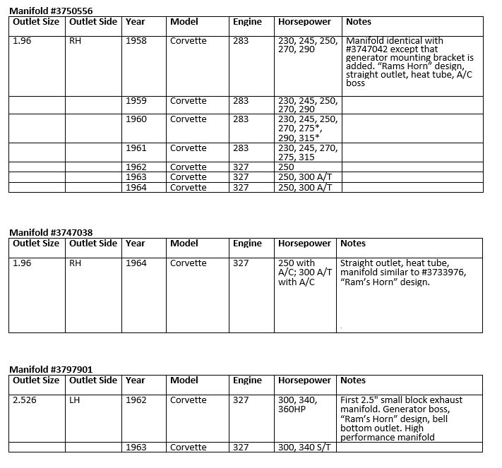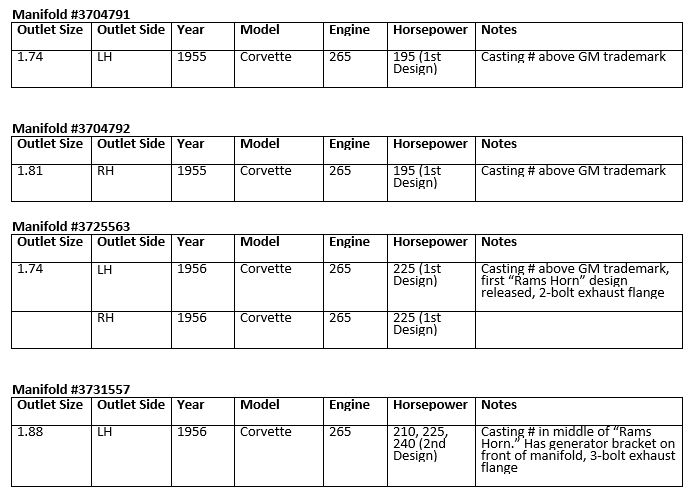 All early Chevrolet Corvette factory exhaust manifolds are cast iron. Since the manifolds are cast, the actual casting number and date are raised above the actual surface of the part. Most casting numbers are visible when the manifold is installed on the engine. The casting number location and casting date location will vary from year to year and sometimes manifold to manifold. Some manifolds will not carry a casting date at all. Small block manifolds do not carry a year designation. 2" outlet small block manifolds will have a casting date, while most 2 1/2" outlet manifolds do not have a casting date. There were two types of manifolds being cast for Corvette, the first from the Flint, Michigan built engines, which were cast in Saginaw, Michigan. All small block Corvettes used these manifolds. The second type was cast at the Tonawanda Engine plant and all Corvette big block engines used these manifolds. The big block manifolds will be discussed and identified in the second installment of this article.