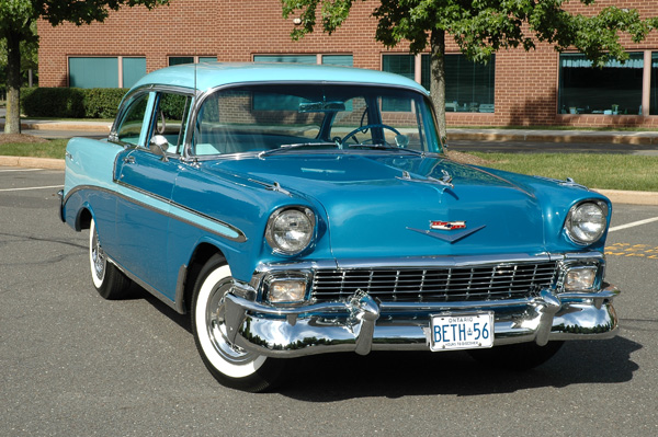 In 1988, a third love arrived. This new baby was a 1956 Chevy Bel Air 2-door post in Nassau Blue and Harbor Blue. My car fascination was back again! Phil immediately named the car Beth, in my honor. We were first introduced to this car in an Old Autos advertisement and since it was a rare car with a 265/225hp TurboFire V8 engine with dual 4-barrel carburetors, which was produced for passenger cars in the last half of the production year of 1956, we decided to buy it.