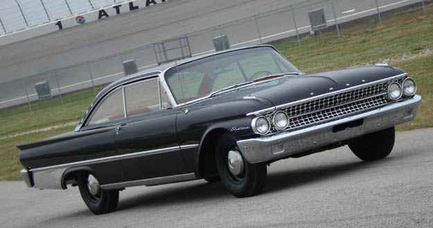 Ford’s commitment to performance continued into 1961 as two hotter versions of the new 390 block replaced the high performance 352 of 1960. Once again Ford cast special blocks and included enough factory high performance goodies in the new Thunderbird Special V8 to earn it the title “Detroit’s hottest street engine” from Car Craft Magazine. The high performance 390 featured a high nodular iron crankshaft spinning heavy duty connecting rods, 11.0 to 1 compression, a solid lifter camshaft and a dual point centrifugal advance distributor. With an aluminum intake manifold and single four-barrel carburetor mounted, the new engine produced an advertised 375 horsepower, and with the optional three two-barrel induction power jumped to 401 ponies. In spite of being hampered by the lack of a four-speed transmission (A Borg-Warner T-10 four-speed became dealer available late in the year) the 401 horse Fords proved to be formidable opponents on the dragstrip. And more often than not, the prestigious Super Stock class title went to one of them on any given Sunday at tracks across the land. On the high banked oval tracks of NASCAR Ford Starliners claimed eleven victories in 1961 serving notice that Dearborn was back in the racing business.