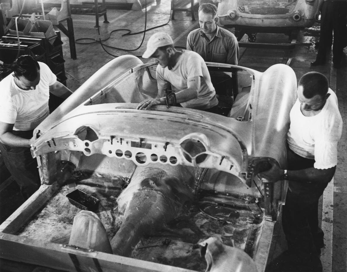 Assembly line workers install the front fiberglass section to the 1953 Corvette. Photo credit: Photo collection of Late Great Chevy