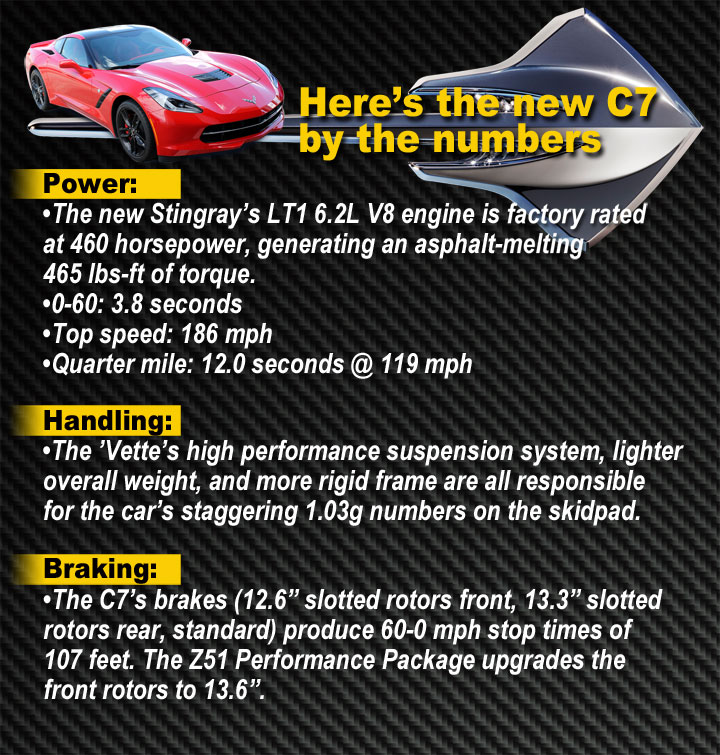 The all-new 2014 Stingray was built from the ground up for ultimate performance driving. Here’s the new C7, by the numbers: