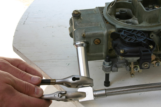 Please note: In the next two photos, we’ve used a different model Holley carburetor to illustrate the change-over. (The carb in these next two photos was already equipped with a dual-inlet fuel bowl).