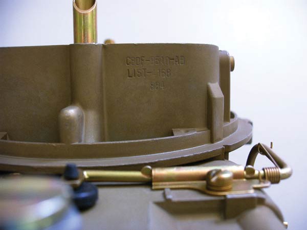 One way to prove that these carbs had manual chokes from the factory is to take a look at the passenger’s side just below the lip where the air cleaner gasket goes. Normally you will see a ¼” fresh air tube sticking out about 2-½” from the main body of the carb. On the manual choke carbs you will see an indentation there, but the hole was never drilled. Hence, the carburetors were never equipped with automatic chokes. Regarding the leftover 1969 Shelbys, the carburetors were the leftover C9AF-M/Ns. At the Shelby plant, they were converted to manual choke and the letters “ED” were stamped in the carburetor tag. The “ED” stands for edited at the factory.