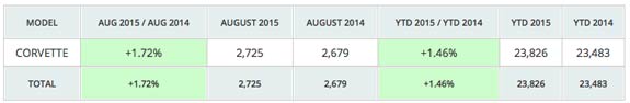 Chevrolet dealers in the United States delivered 2,725 units of the Corvette sports car to customers during the month of August 2015, representing a year-over-year growth of 1.72 percent.