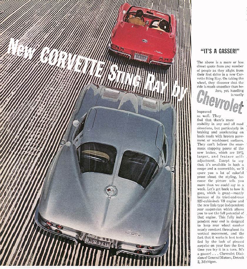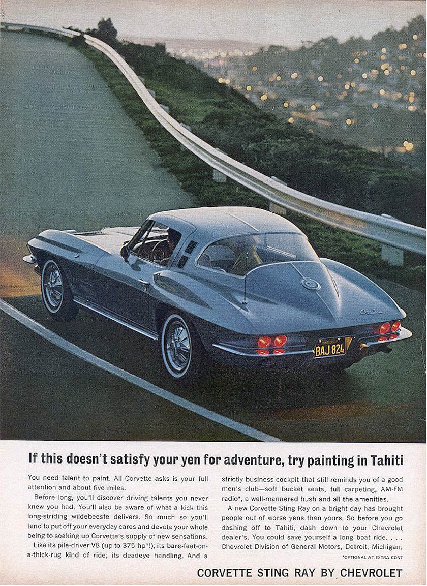 This 1964 Corvette ad featured a more subdued looking gray Coupe winding up a mountain road, in search of adventure. Could it be Mulholland Drive? 327 power was now rated at 375 horses.