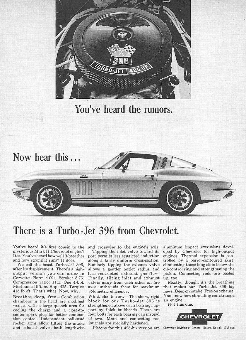 1965: Introduction of the 396 big-block! Chevrolet got serious about the ad here: black and white, very to-the-point and factual. Why wouldn’t they? This car was not to be ignored.