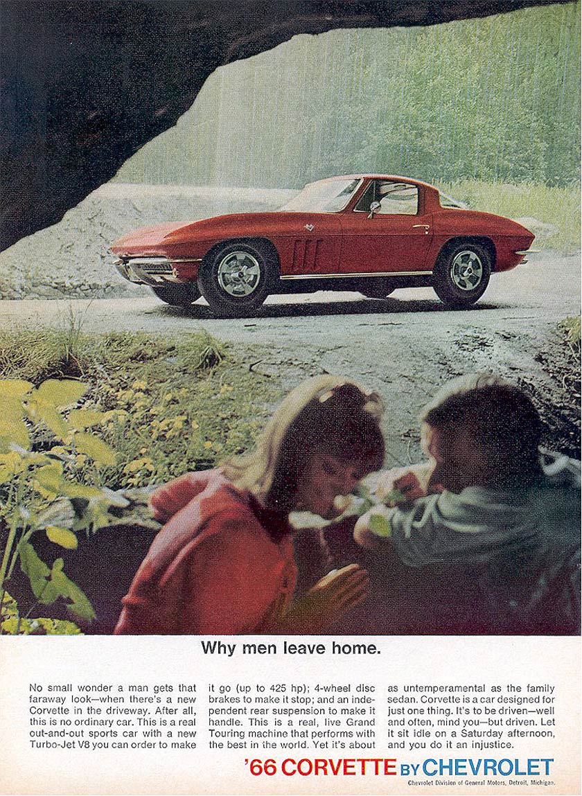 For 1967, this full color print ad said it all: A Wolf in Wolf’s Clothing. Chevrolet admen really knew how to play on the emotions! This was the last year for the “mid-year” Corvettes, as 1968 would usher in an all-new body style.
