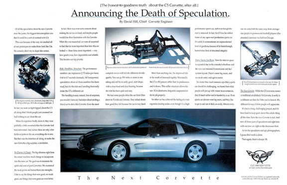 For the C5’s introductory year (1997), Chevrolet was intent on spelling everything out in plain English. This 2 page spread print ad was written by none other than David Hill, the Chief Corvette Engineer at the time. The very wordy ad touts all the new car’s attributes– from its all-new 5.7L aluminum engine (now rated at 345 hp) to its state-of-the-art hydroformed perimeter frame. Easy to see why Chevy executed this ad: they “Changed a Classic”, as they state in the ad’s second paragraph.