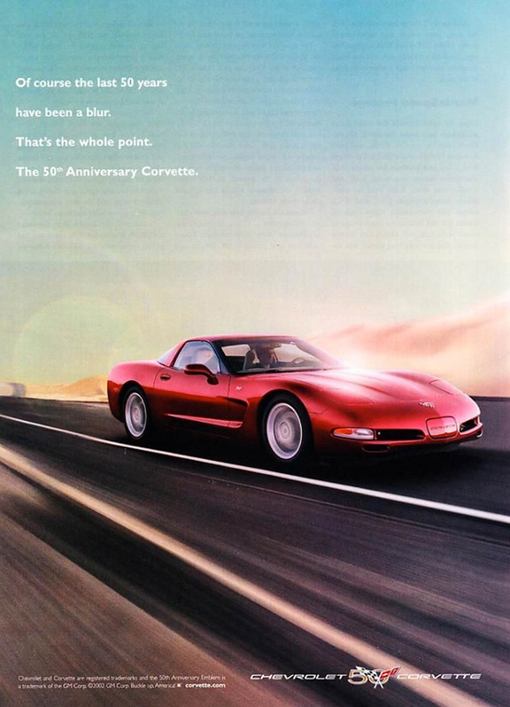 One the most subtle ads for Corvette ever. You could order the special 50th Anniversary package (for the 2003 model year) by requesting the 1SC equipment group– available on Coupes and Convertibles, but not Hardtops. The package included Anniversary Red “Xirallic Crystal” exterior paint, unique front fender emblems, champagne painted aluminum wheels and center caps, and a new Shale interior. These models featured the new F55 Magnetic Selective Ride Control system, which was optional on non-Anniversary Coupes and Convertibles. 4085 Coupes and 7547 Convertibles were ordered with this special Anniversary package.