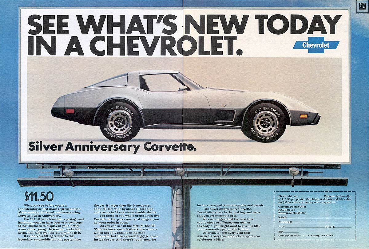 1978 was the “Official Pace Car” year for the Corvette, and for the Silver Anniversary Edition. Check out this billboard ad. You could actually order a 21 foot by 10 foot high poster of this car – in “12 easy-to-assemble” sheets, for $11.50! Sole motivation were the 350 cube V8s, rated between 175 and 220 hp, depending on transmission choice and options.