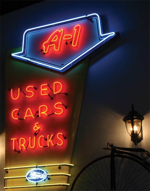 This is half of an original neon sign from the 1930s. These signs were hung out in front of the dealerships.