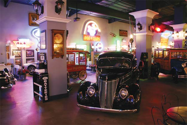 The entrance to the Museum: The main car pictured here is a 1937 Ford Coupe Street Rod with a 302 Ford engine.
