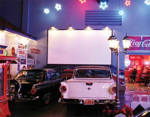 The drive-in cars are a 1956 Ford Thunderbird (this is the oldest restoration in the museum and was completed by David in 1970) and a 1958 Ford Ranchero (this is a representation of David’s first car and was purchased a few years back and restored by Sanderson’s Body Shop). The drive-in was added to the museum as a cool way to show videos and movies at parties and events.