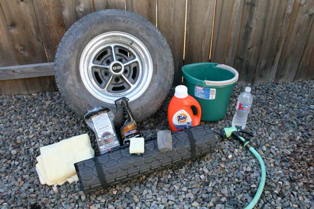 Here’s our “beauty” shot: Our wheel and tire, a few rags, a mat (for kneeling on), some 00 grit steel wool, a scouring pad, some 2X Ultra Tide (with bleach), a bucket, garden hose, some Meguiar’s Gold Class Vinyl/Rubber Protectant, and that bottle of water was for us. We’re doing this in 85F heat, but in the shade.