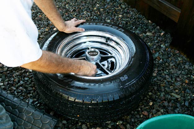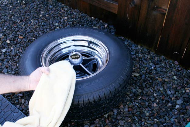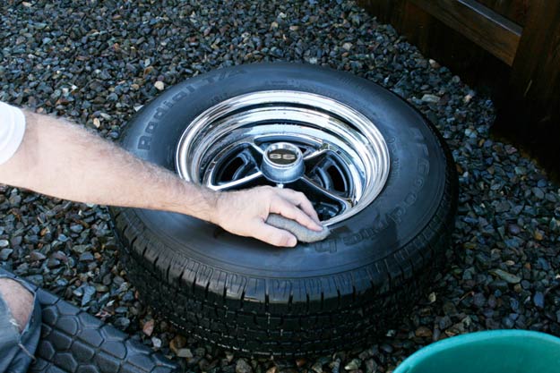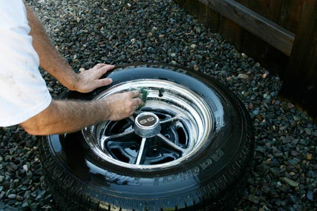 Our project Chevelle was in the shop undergoing bodywork, primer, more bodywork, more primer, some finessing bodywork, a little more primer…well, you get the idea. The car was moved around in the shop (a lot) over the course of the months, and quite often, our wheels and tires were the unlikely recipient of some nasty overspray, rubbing compound, etc.