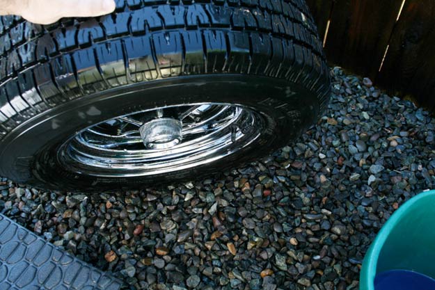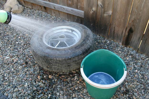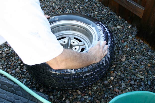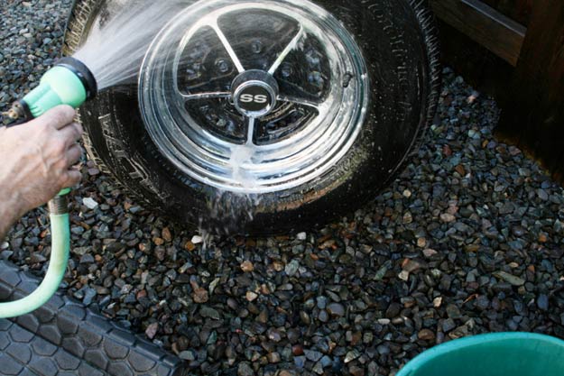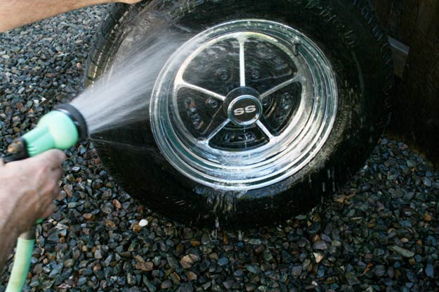 After yet another rinsing, we set the tire on a slight angle, letting excess water run out of the rims.