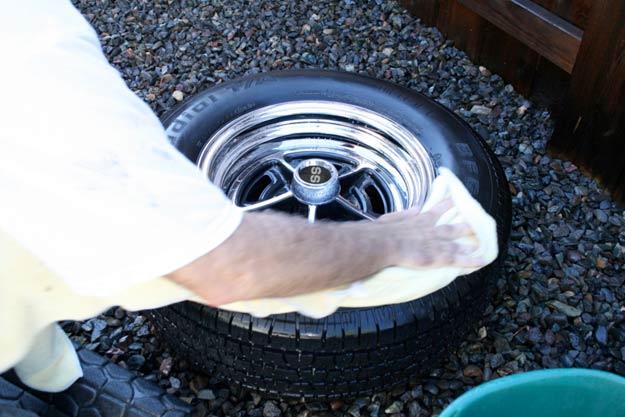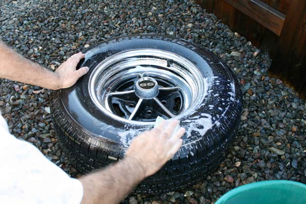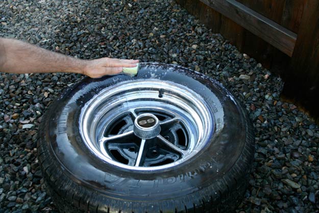 We give it another scrubbing, this time really focusing on the outer edge of where the wheel meets the tire. Dirt tends to accumulate here.